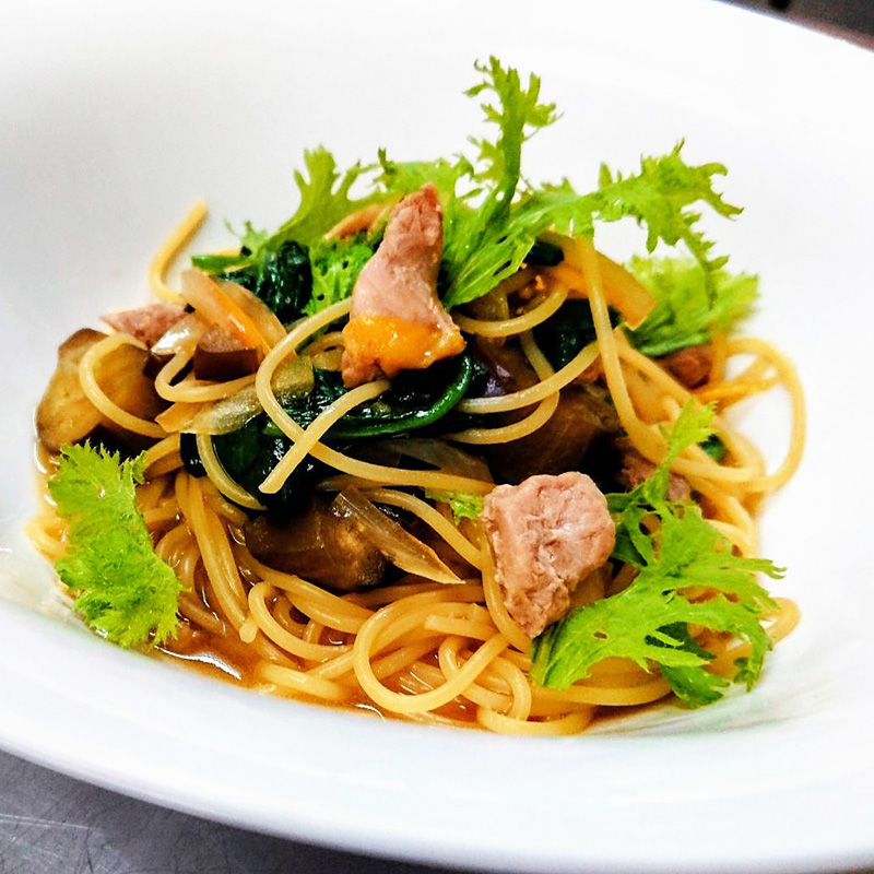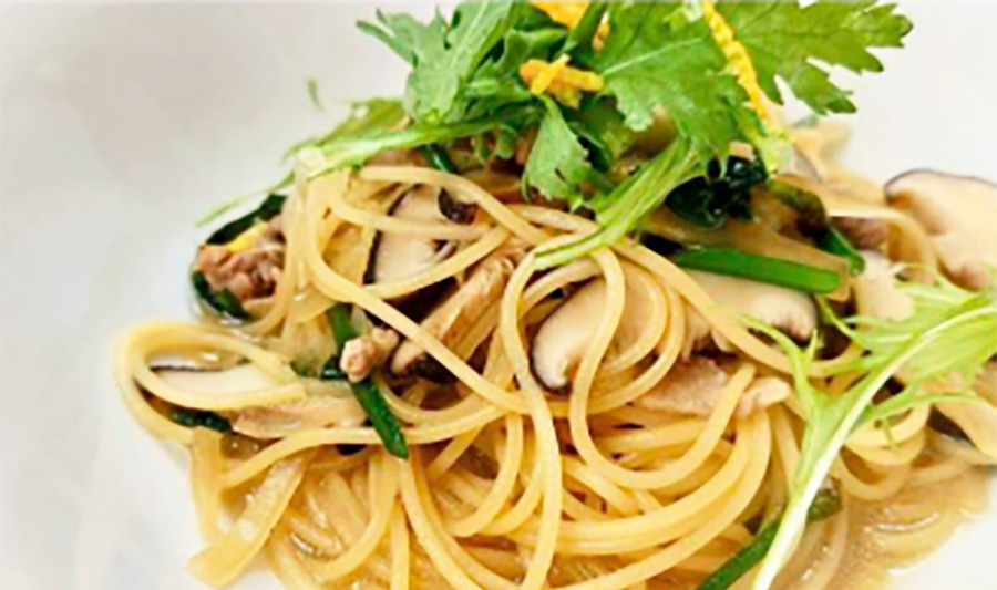 梼原特産のキジ肉と旬の野菜を使用した和風パスタ。